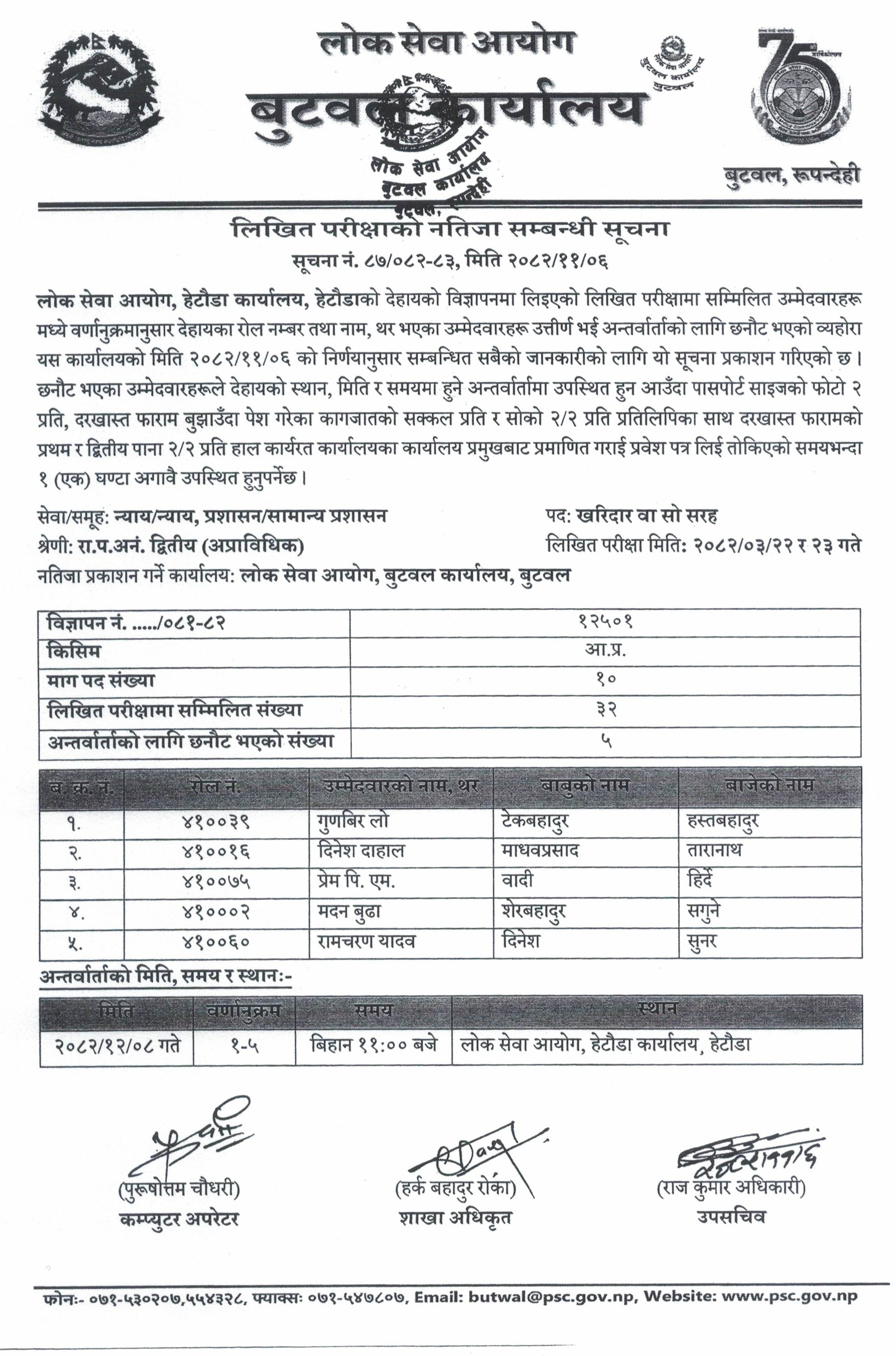 लोक सेवा आयोग, हेटौडा कार्यालय को विज्ञापन नं १२५०१/०८१-८२ (आ.प्र.), संयुक्त र एकीकृत परीक्षा प्रणाली अन्तर्गत रा.प.अनं. द्वितीय श्रेणी (अप्राविधिक), खरिदार वा सो सरह पदको लिखित परीक्षाको नतिजा ।
